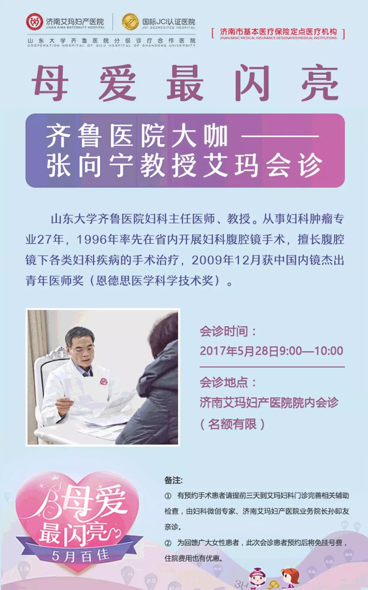 5月28日,济南艾玛妇产医院“齐鲁医院艾玛妇科工作室”专家——妇科主任医师,张向宁教授将再次来我院会诊。2016年11月,在艾玛妇产联合妇科举办的“齐鲁医院妇科技术培训班(第期)”期间,张向宁教授就曾在艾玛妇产为患者会诊,很多女性朋友慕名而来。